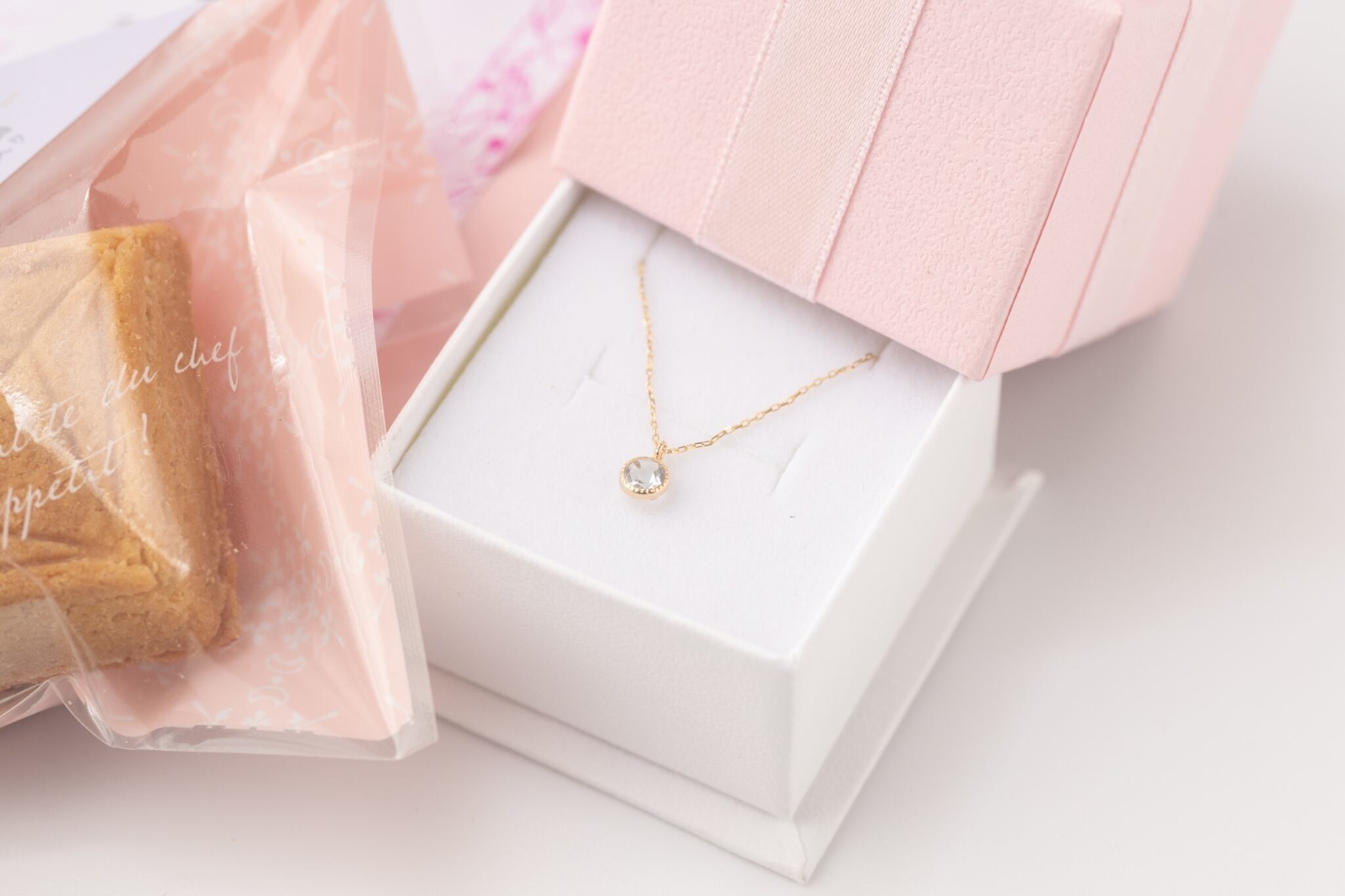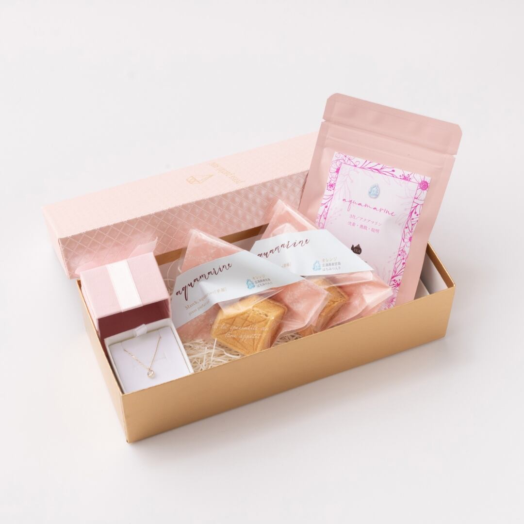 3月誕生石1粒アクアマリンネックレス&ダイヤモンド型バターサンド&紅茶セット【手土産・誕生日・お祝いに最適】