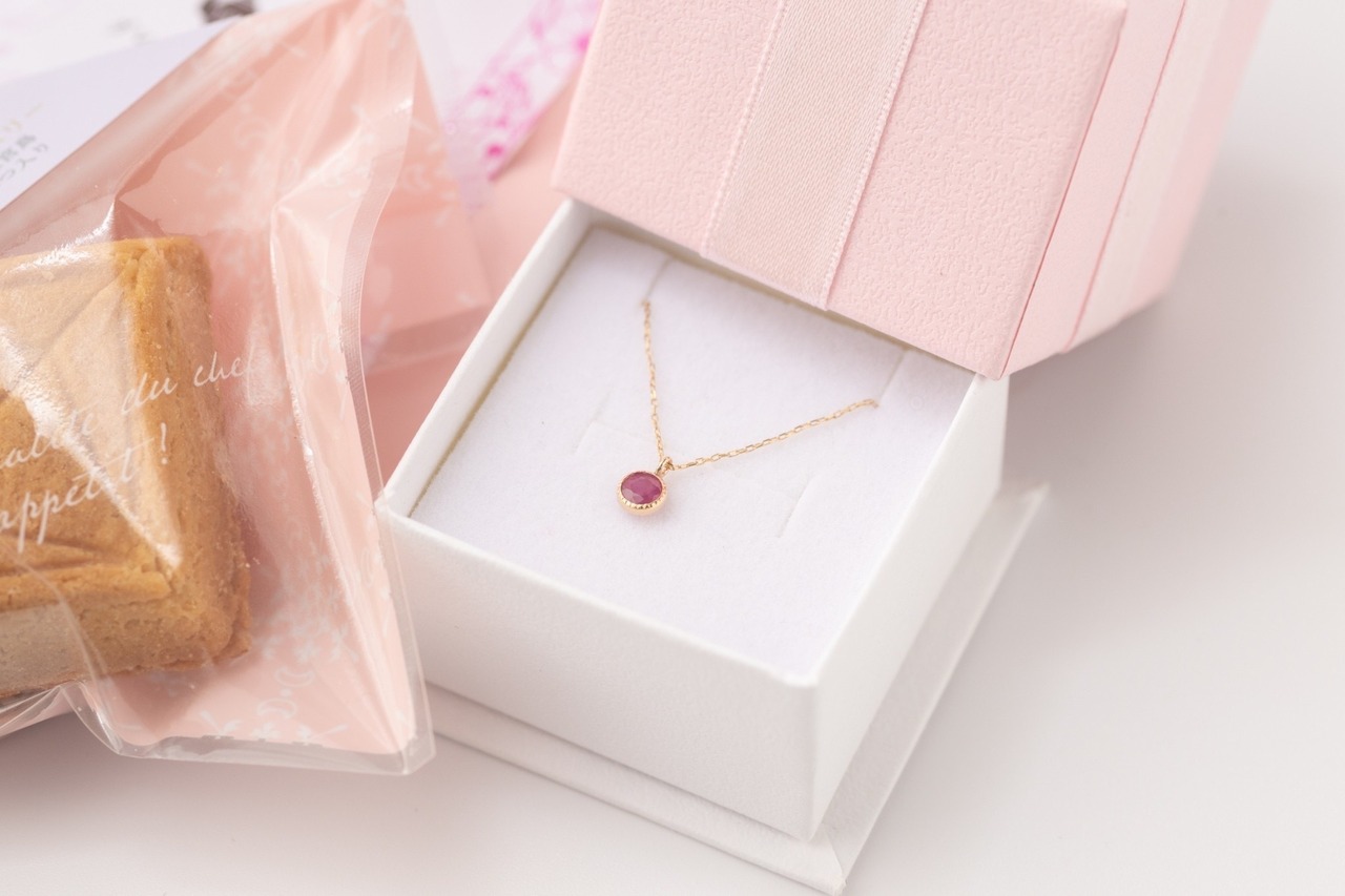 7月誕生石1粒ルビーネックレス&ダイヤモンド型バターサンド&紅茶セット【手土産・誕生日・お祝いに最適】