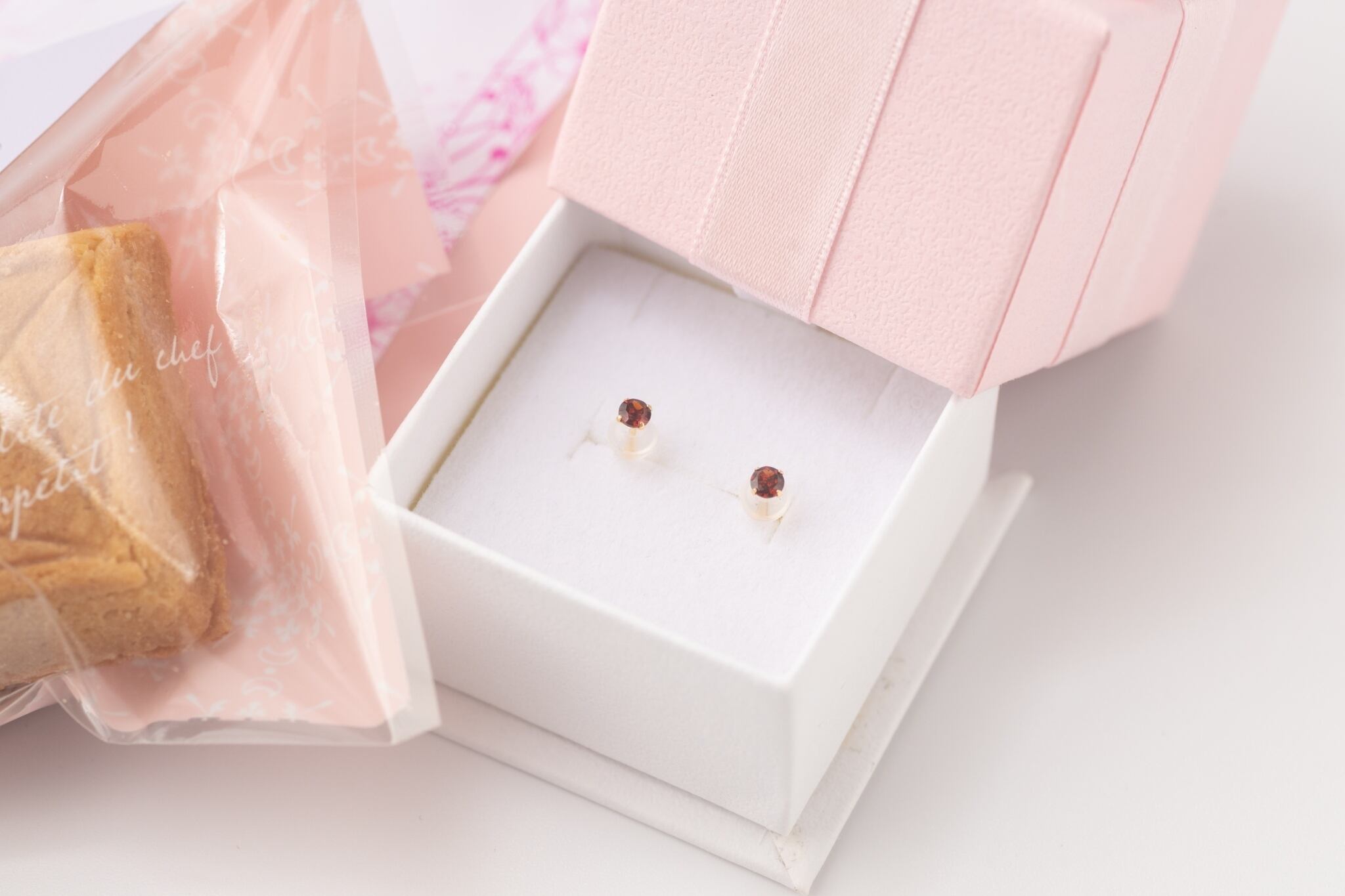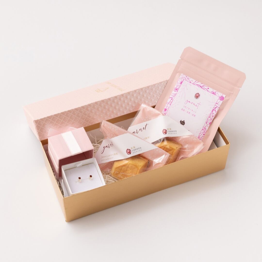 1月誕生石1粒ガーネットピアス&ダイヤモンド型バターサンド&紅茶セット【手土産・誕生日・お祝いに最適】