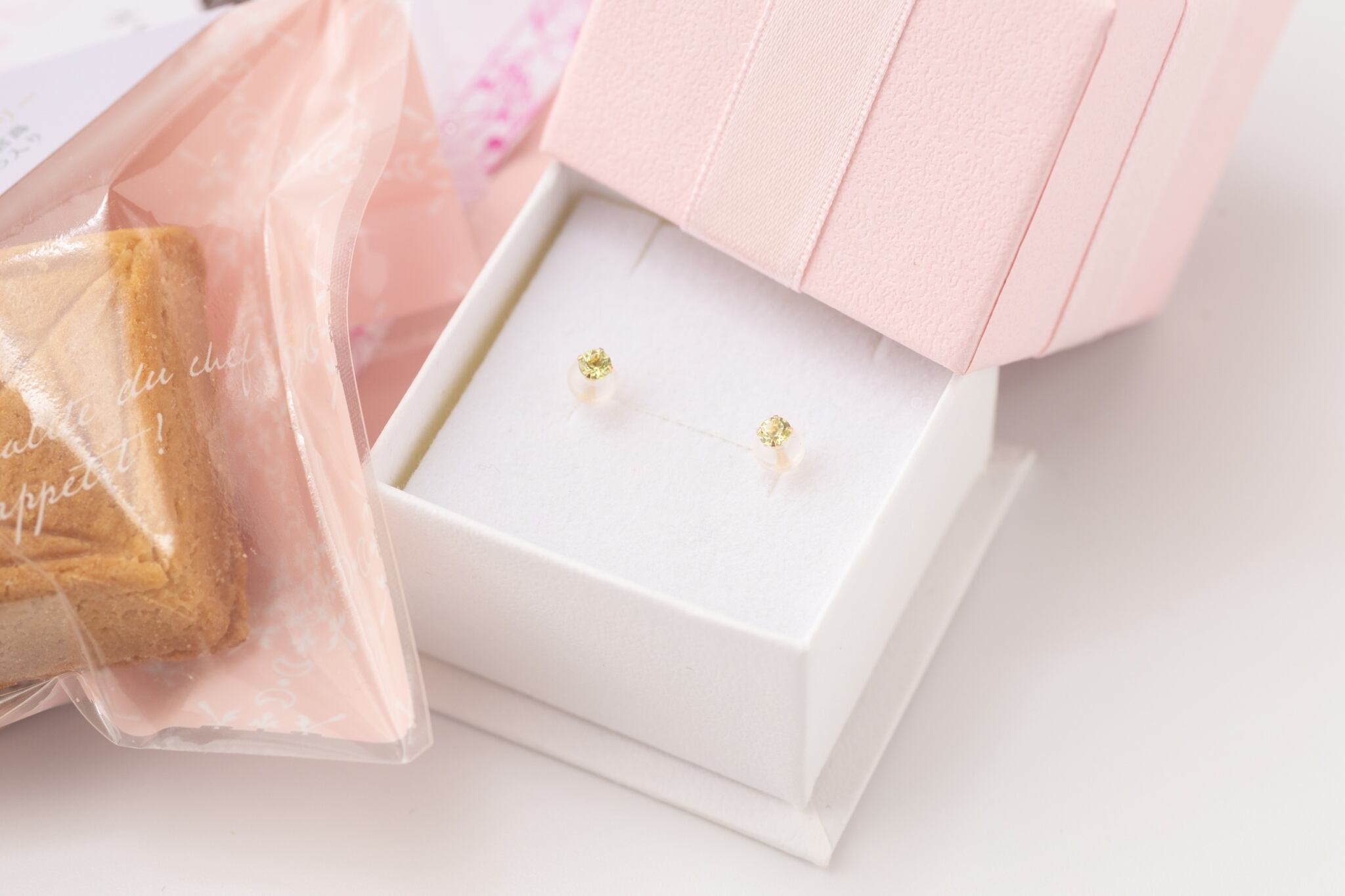 8月誕生石1粒ペリドットピアス&ダイヤモンド型バターサンド&紅茶セット【手土産・誕生日・お祝いに最適】