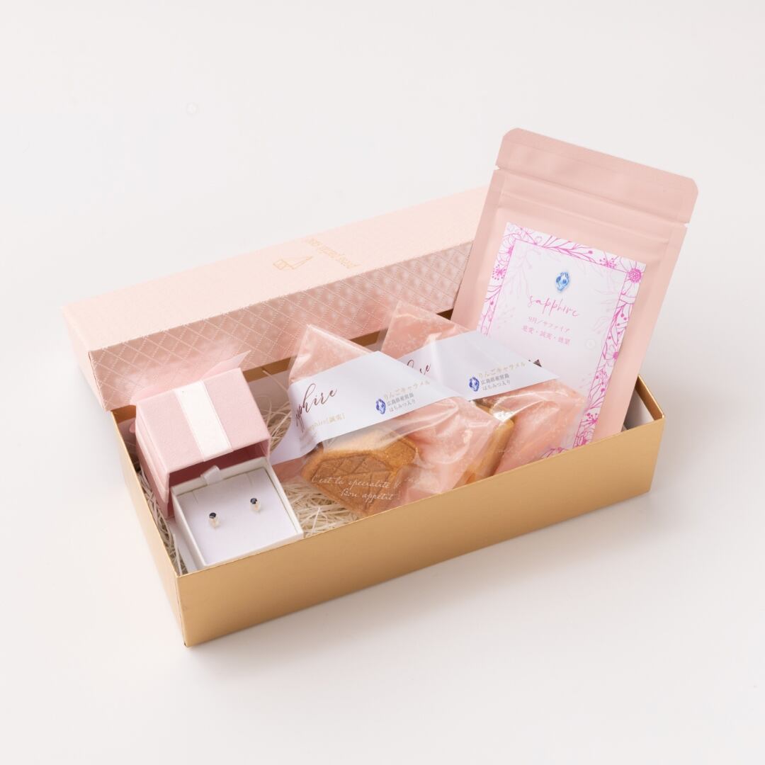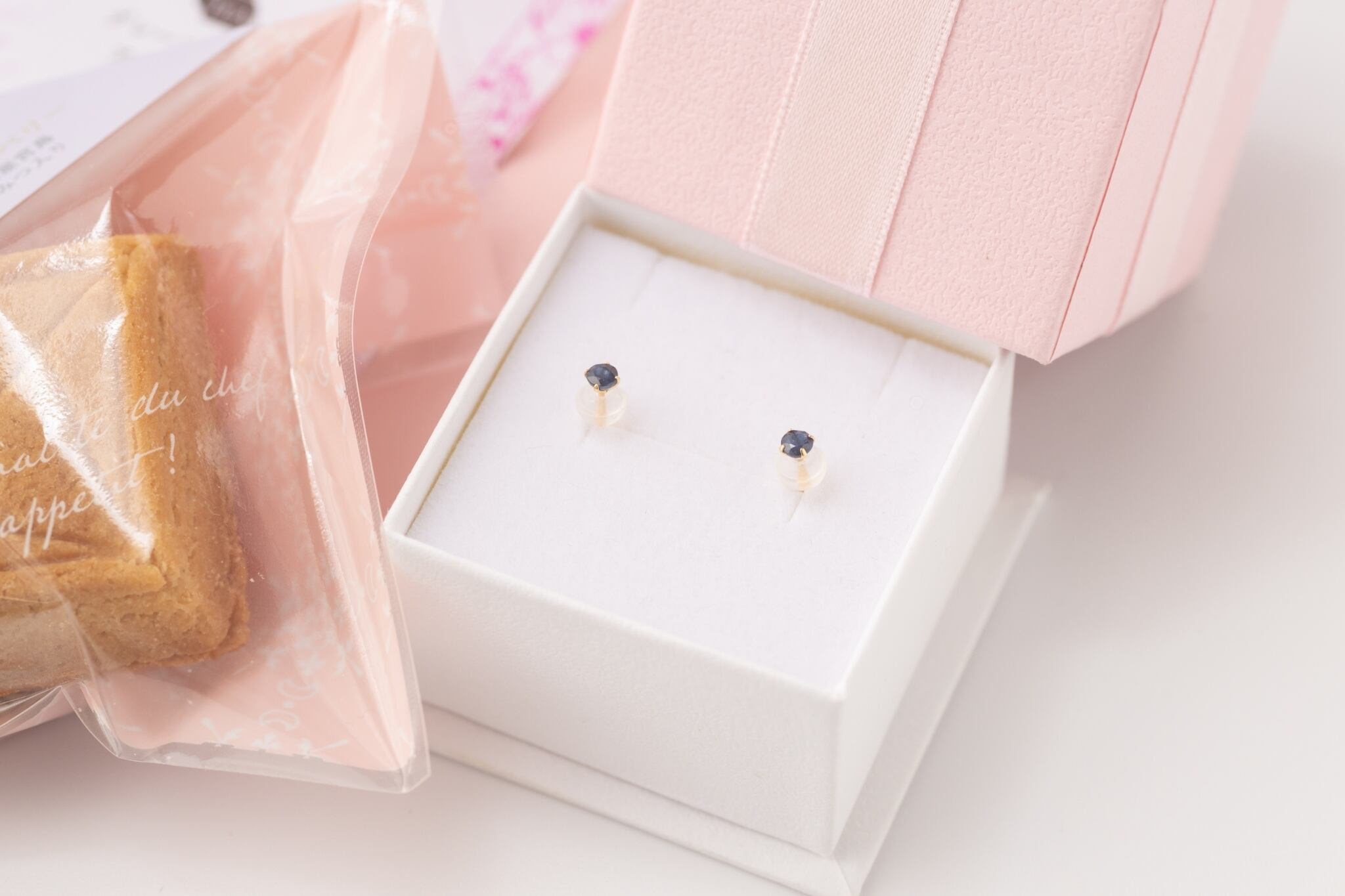 9月誕生石1粒サファイアピアス&ダイヤモンド型バターサンド&紅茶セット【手土産・誕生日・お祝いに最適】