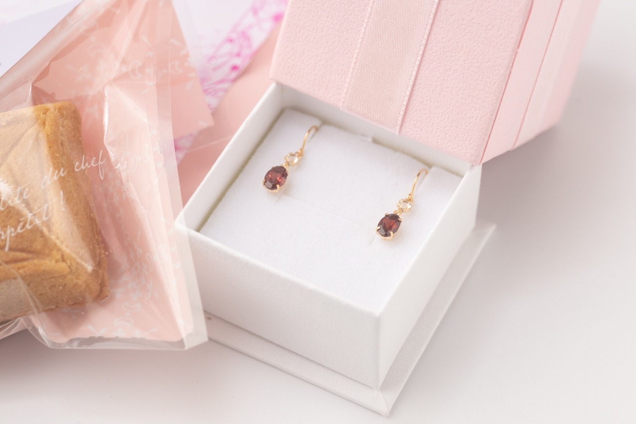 1月誕生石揺れるガーネットピアス&ダイヤモンド型バターサンド&紅茶セット【手土産・誕生日・お祝いに最適】