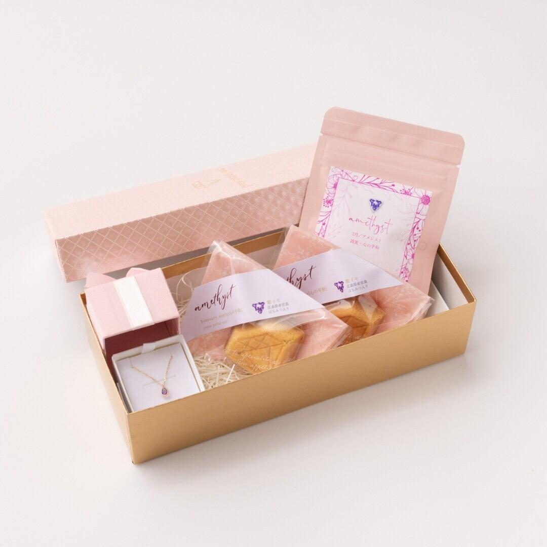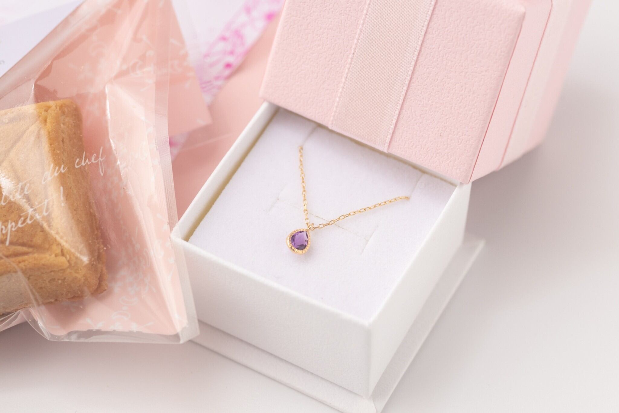 2月誕生石ドロップ型 アメジストネックレス&ダイヤモンド型バターサンド&紅茶セット【手土産・誕生日・お祝いに最適】